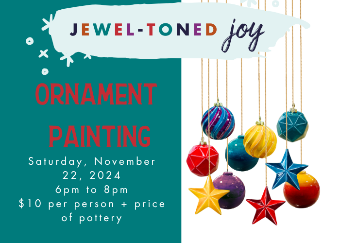 Come paint ornaments for the up coming Holiday Season on Saturday, November 22 from 6pm to 8pm!